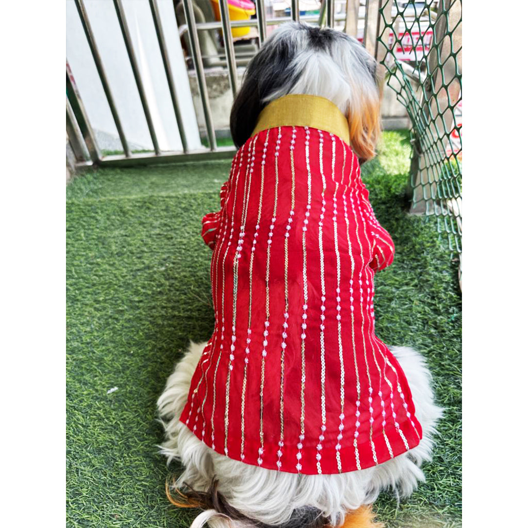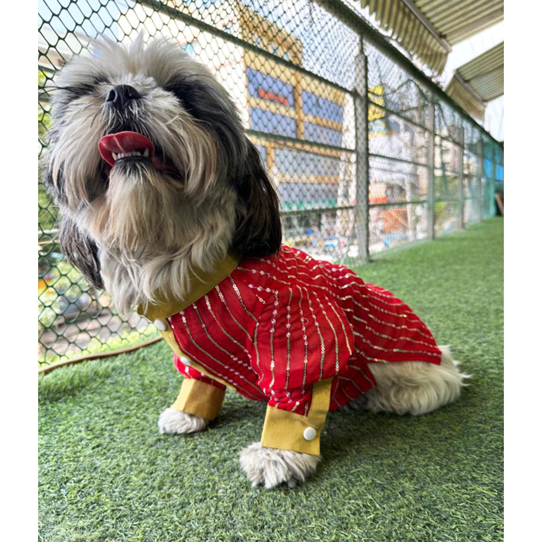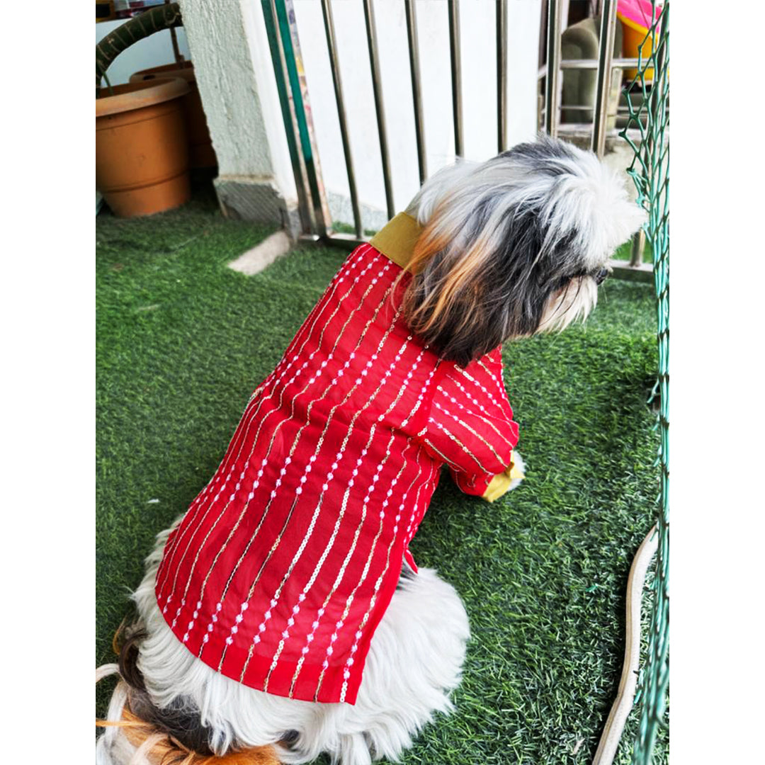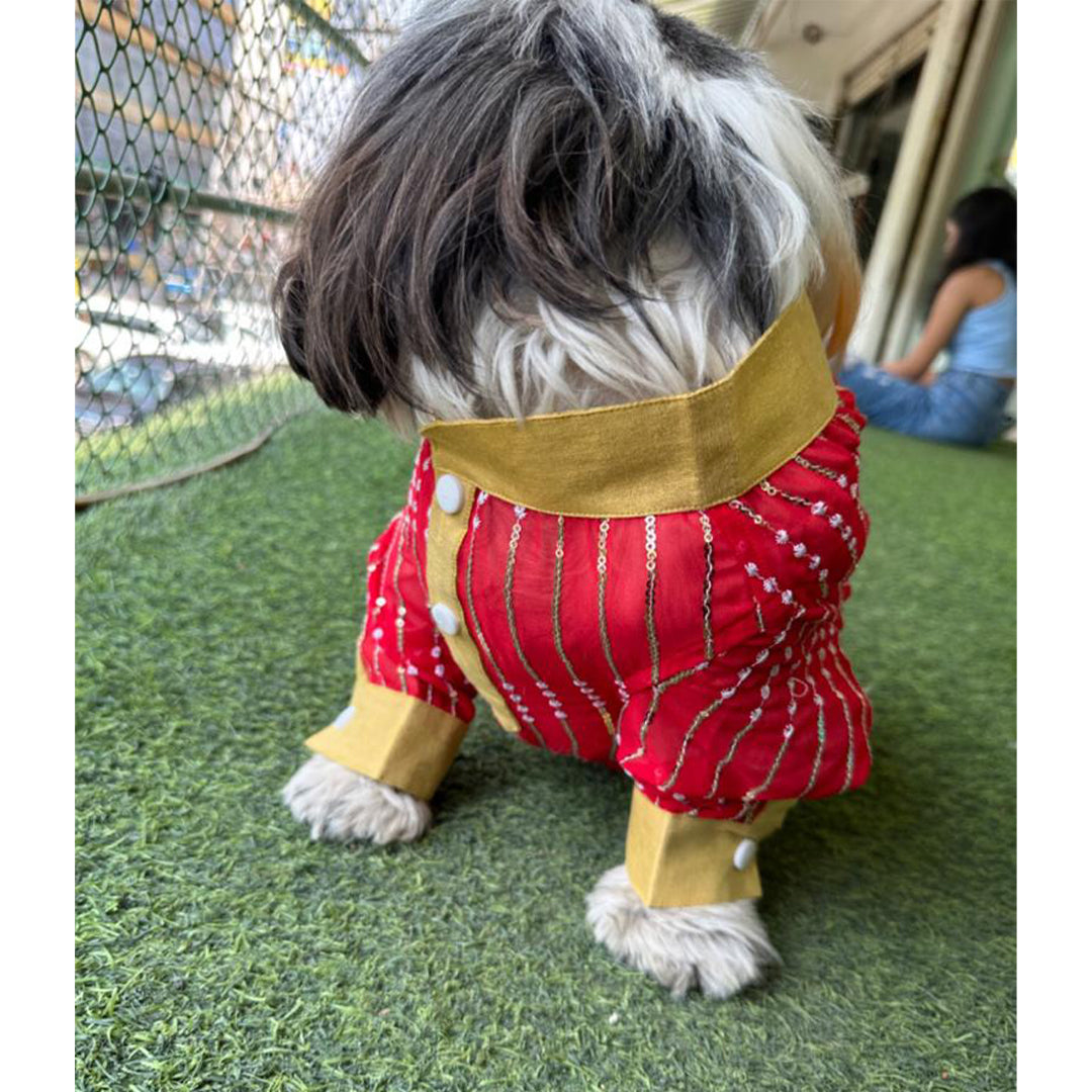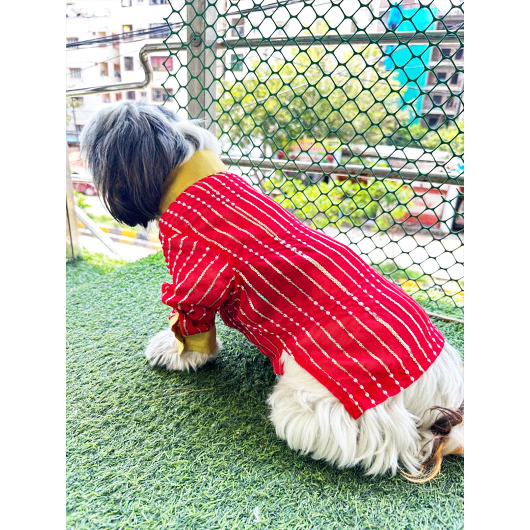 Bringing to you our designer kurtas for your little sher! We have you covered for your little one's ethnic outfit that will steal away the hooman's thunder! So comfortable, the little one can pounce around like a sher without a hint of discomfort. With a mandrian collar and placket with push buttons , the pet will be festive ready in a jiffy and just in time to join the family celebrations! Shop now and treat your dog to the elegance of Indian-inspired fashion.